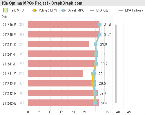 Right after leasing the car, Kia (and parent company Hyundai) was docked by the EPA for overstating their MPG numbers. The new estimates were 39 Highway and 34 City, for an average of 36. Kia is trying to make it right, though, through partial reimbursements that you can read about here.